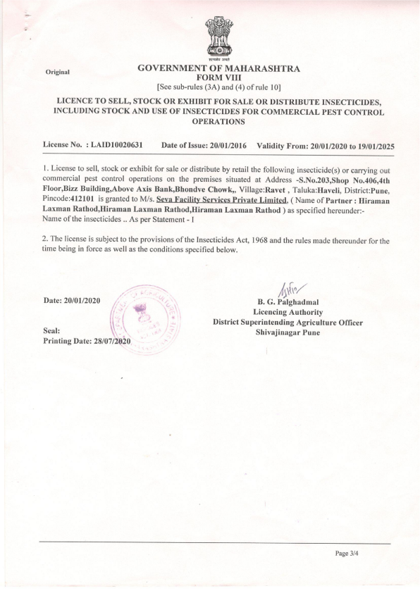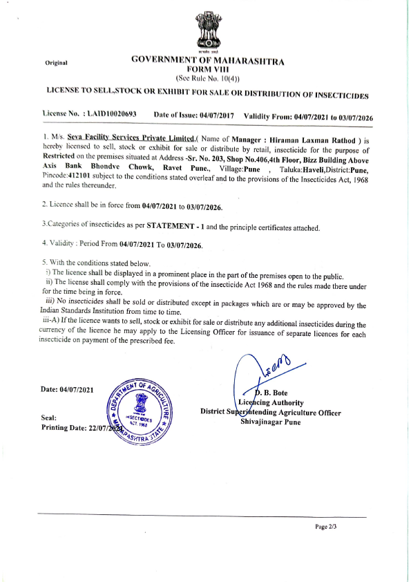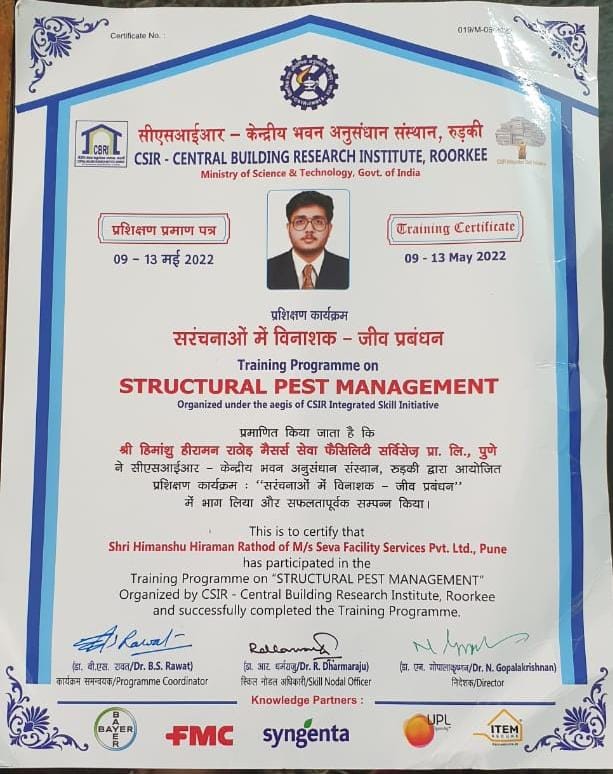 Seva Facility Services Private Limited, a pest control company established in March 2016 by Hiraman Rathod, who is Msc Agriculture with specialization in Plant Pathology with 30 + years’ experience in service industry. Company provide various pest control services to residential, commercial, industrial segment. Accredited for fumigation with methyl bromide as per NSPM 11/12 and ISPM 15 International standard, including Australian consignment – AQIS. Accredited for fumigation with aluminium phosphide as per NSPM 22 for export container & commodity fumigation. Apart from pest control and fumigation service we have separate set up for water tank cleaning, housekeeping and security services for our esteemed customers. We have dedicated expert team for each section. Company is having 25000+ satisfied customers across India in different segment. Head Office is at Pune, Maharashtra, India. Branches at Mumbai, Aurangabad, Amravati, Nagpur, Belgaum, Indore,Hyderabad and Nizamabad. For more details kindly visit service page which you are looking for.
